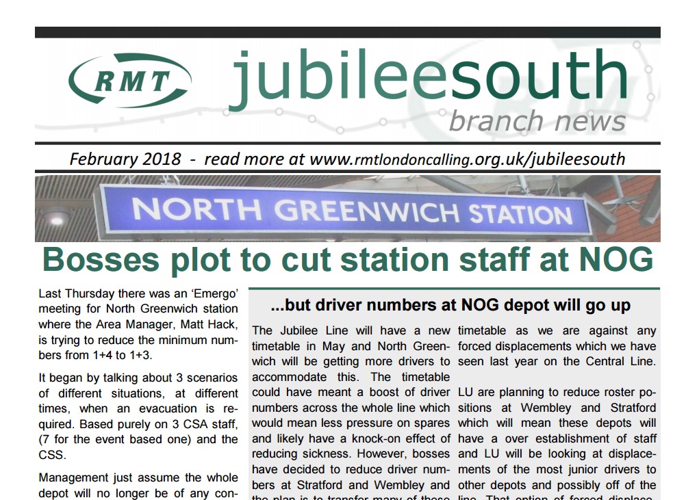 Jubilee South News is the newsletter for workers on the Jubilee Line between Stratford and Westminster, including station staff and train drivers, SMD controllers cleaners and caterers. It is produced by RMT activists from the Jubilee South branch.